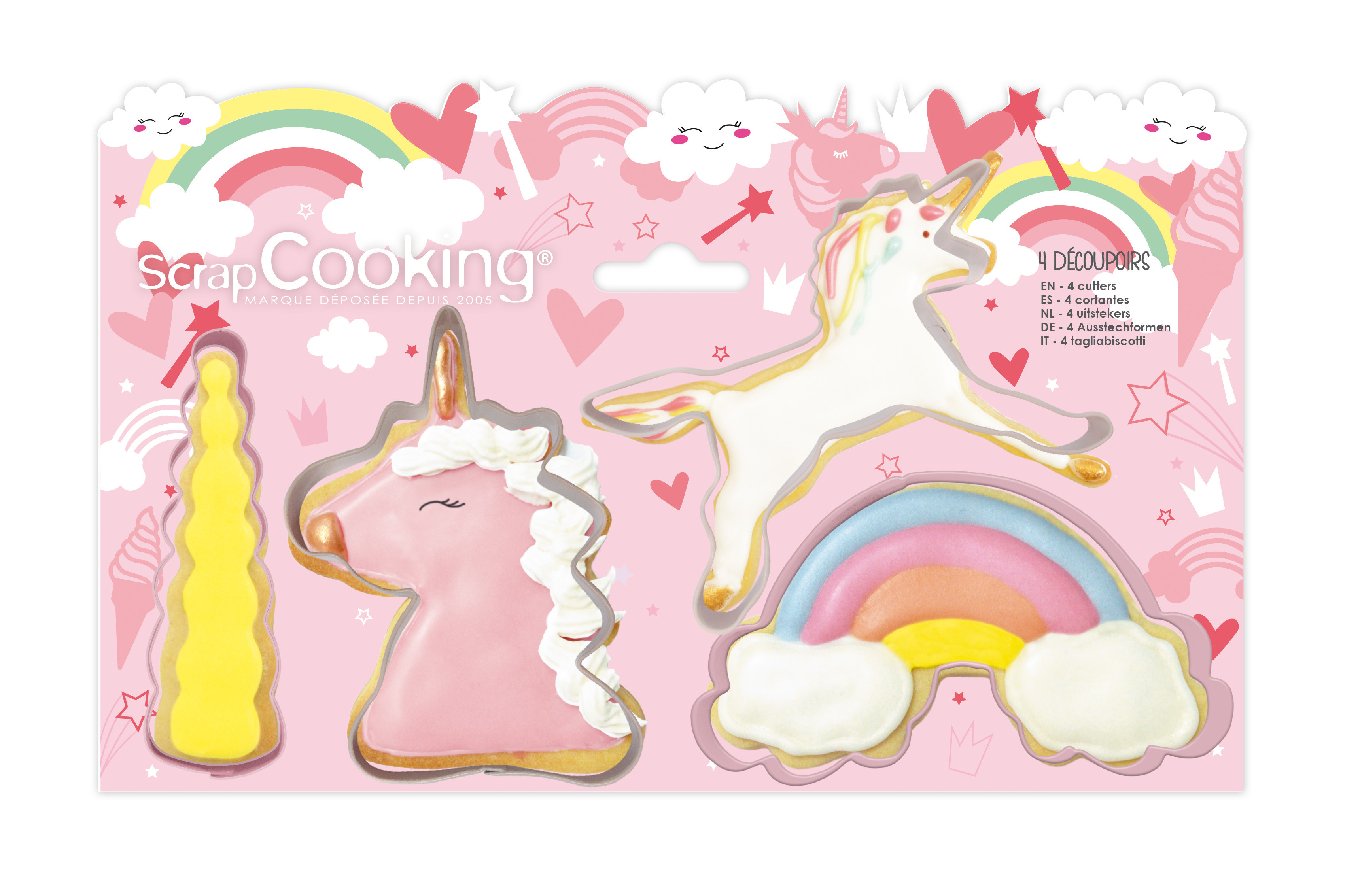 A kit of unicorn cookie cutters with 4 different shapes to cut your biscuits or pastries decos and travel into an enchanted world !