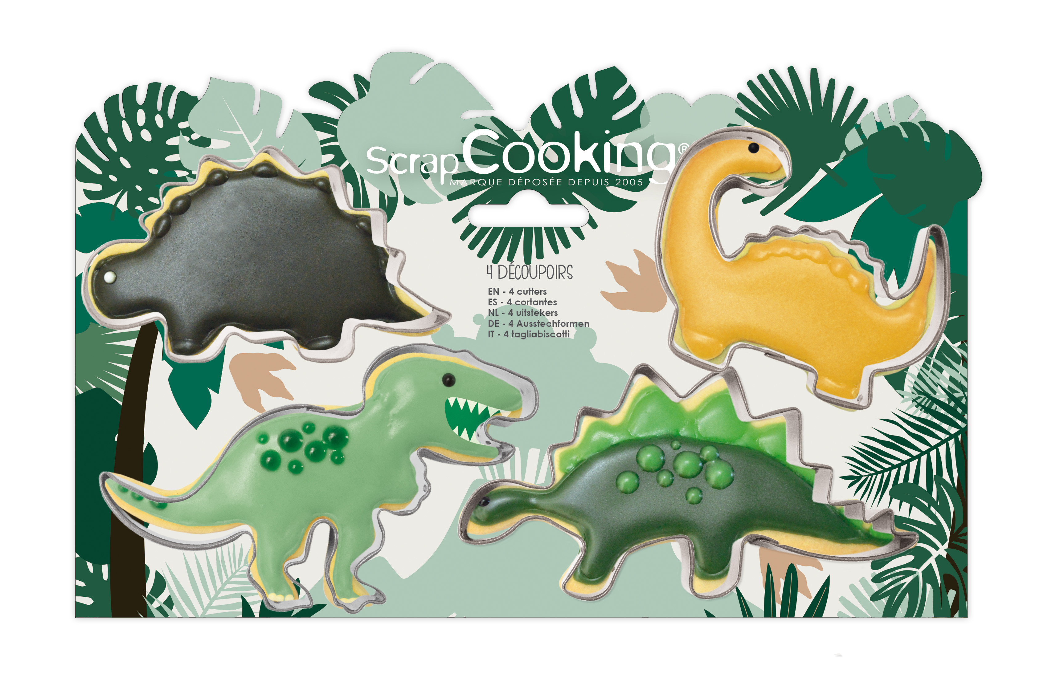 A kit of dino cookie cutters with 4 different shapes to cut your biscuits or pastries decos and travel into the jurassic world !