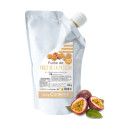 Puree obtained from passion fruit harvested when ripe and sorted. The fruit is mechanically crushed and sieved to separate the pulp from the seeds.