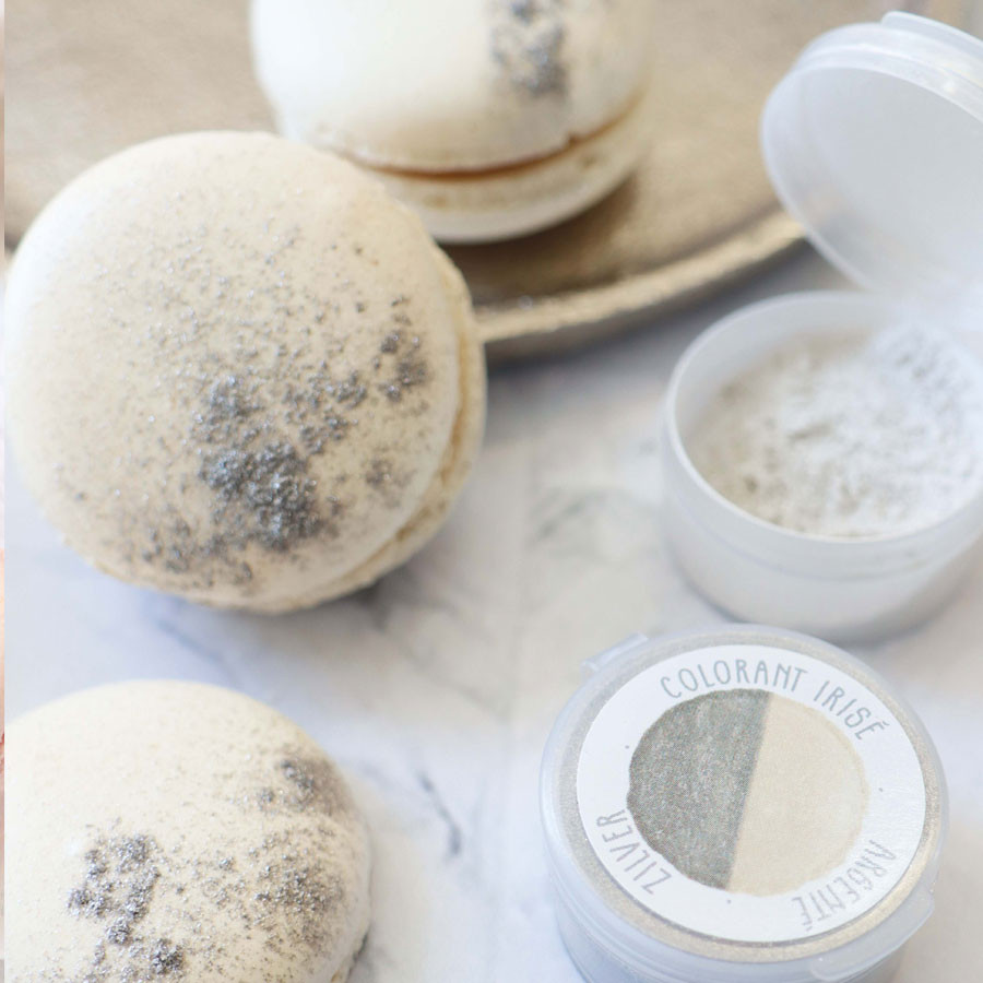 Pearlescent, silver, rose gold, gold, ruby, turquoise, blue, violet surface colouring powder - Ingredients: carriers: potassium aluminium silicate E555, silicon dioxide E551; colourings: iron oxides and hydroxides E172, silver E174, brilliant blue FCF E133, carmine E120. May contain traces of EGG, NUTS, PEANUTS, SOYA, MILK, SESAME, MUSTARD, SULFITES.