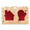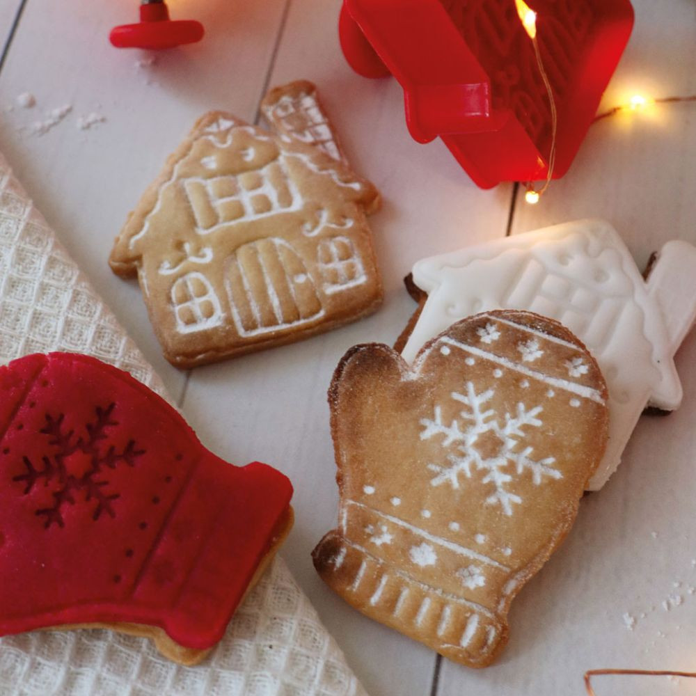This set of 2 ejector biscuit cutters is ideal for making original Christmas biscuits or shortbread. Thanks to their 3-in-1 function, they cut, emboss and eject dough in a single movement for a clean finish. The pack contains two cutters in wintery shapes: a little house and a mittens, with embossed details printed directly on them.