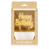 Birthday decorating kit featuring white muffin cups and gold glitter “Happy Birthday” cake toppers on food-safe wooden picks. Ideal for easily adding a festive touch to your cupcakes and birthday cakes.
