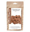 Resealable kraft paper bag of milk chocolate couverture pellets. Perfect for desserts, chocolate decorations, fondues.