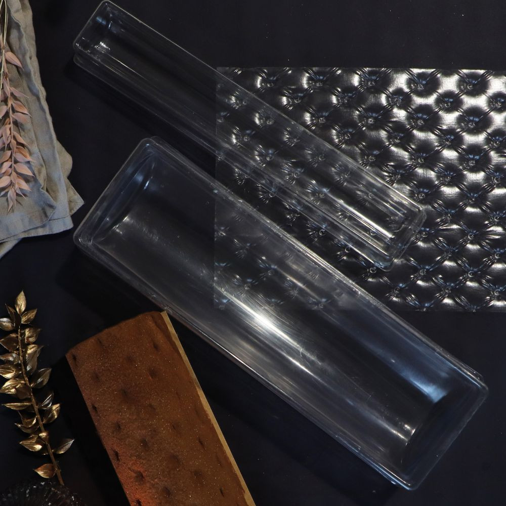 1 log mould and 1 semi-rigid insert: Material: Food grade transparent APET Large log dimensions: L 33 cm x w 11.5 cm x H 6 cm Log insert dimensions: L31 cm x w 3 cm x H 6 cm 1 quilted pattern sheet: Material: Food grade APET 2 gold-coloured cake bases: Material: food grade carton + PET film Dimensions: 30 x 10 cm / thickness 1mm Made in France.