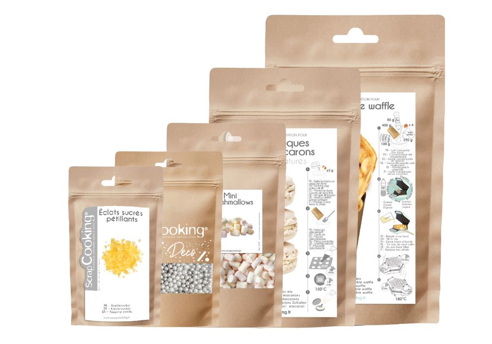 Since 2024, we have been committed to changing our packaging for sweet decorations, culinary aids, ingredients, preparations and glazes. From now on, it will be possible to see all our packaging in bags and kraft cards for the majority of our food products on our website and in stores.