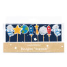 DES BOUGIES DÉCORATIVES - Un assortiment de 8 bougies en paraffine inspirées de l’univers de l'espace. De magnifiques décorations pour donner un style spatial à un gâteau d’anniversaire, à vos cupcakes et autres pâtisseries.