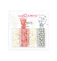 Mix de décors sucrés plein d'amour : perles blanches, cœurs rouges, cœurs blancs, perles argentées. À parsemer sans modération sur vos pâtisseries ou en décor de table. Un joli assortiment coloré qui fera rêver tous les amoureux, petits et grands. Ces décors alimentaires sont comestibles, sans huile de palme et sans colorant azoïque.