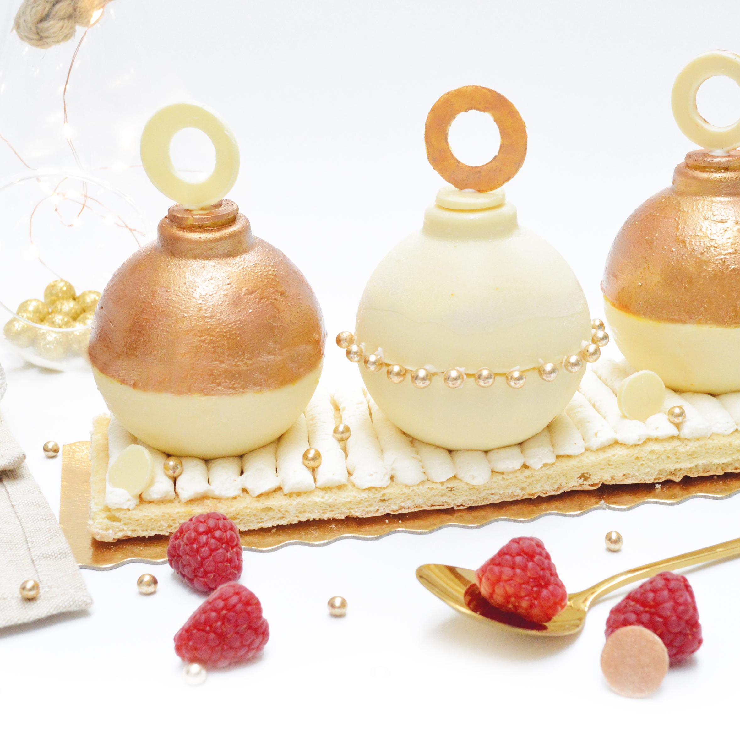 Cette recette de bûche est parfaite pour sublimer vos fêtes de fin d’année, réalisée avec notre tapis silicone motif ondine, elle est idéale pour ravir petits et grands ! À l’intérieur, une coque en chocolat blanc qui renferme un insert et une mousse framboise, associés à une dacquoise moelleuse et un croustillant praliné noisettes. Un délicieux mariage de fruits et de chocolat qui séduira les amoureux des saveurs framboisées !