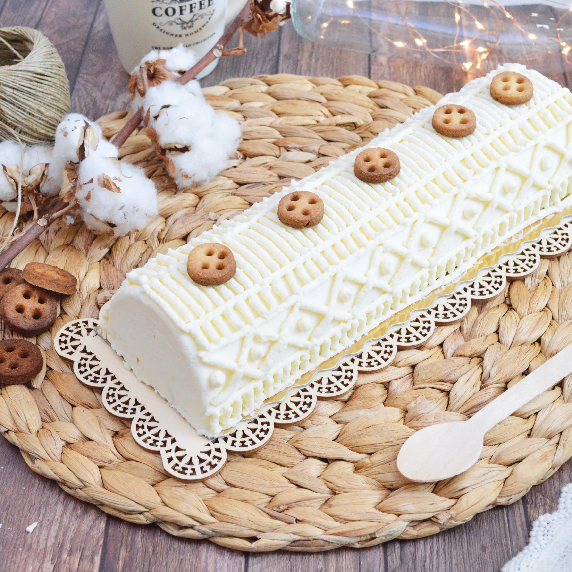Découvrez une recette gourmande composée d'un biscuit dacquoise, d'un croustillant praliné, d'une ganache montée et d'une mousse vanille/marrons. La touche finale de votre bûche : un pochage façon tricot et des petits biscuits boutons pour un esprit très cocooning, parfait pour le réveillon.