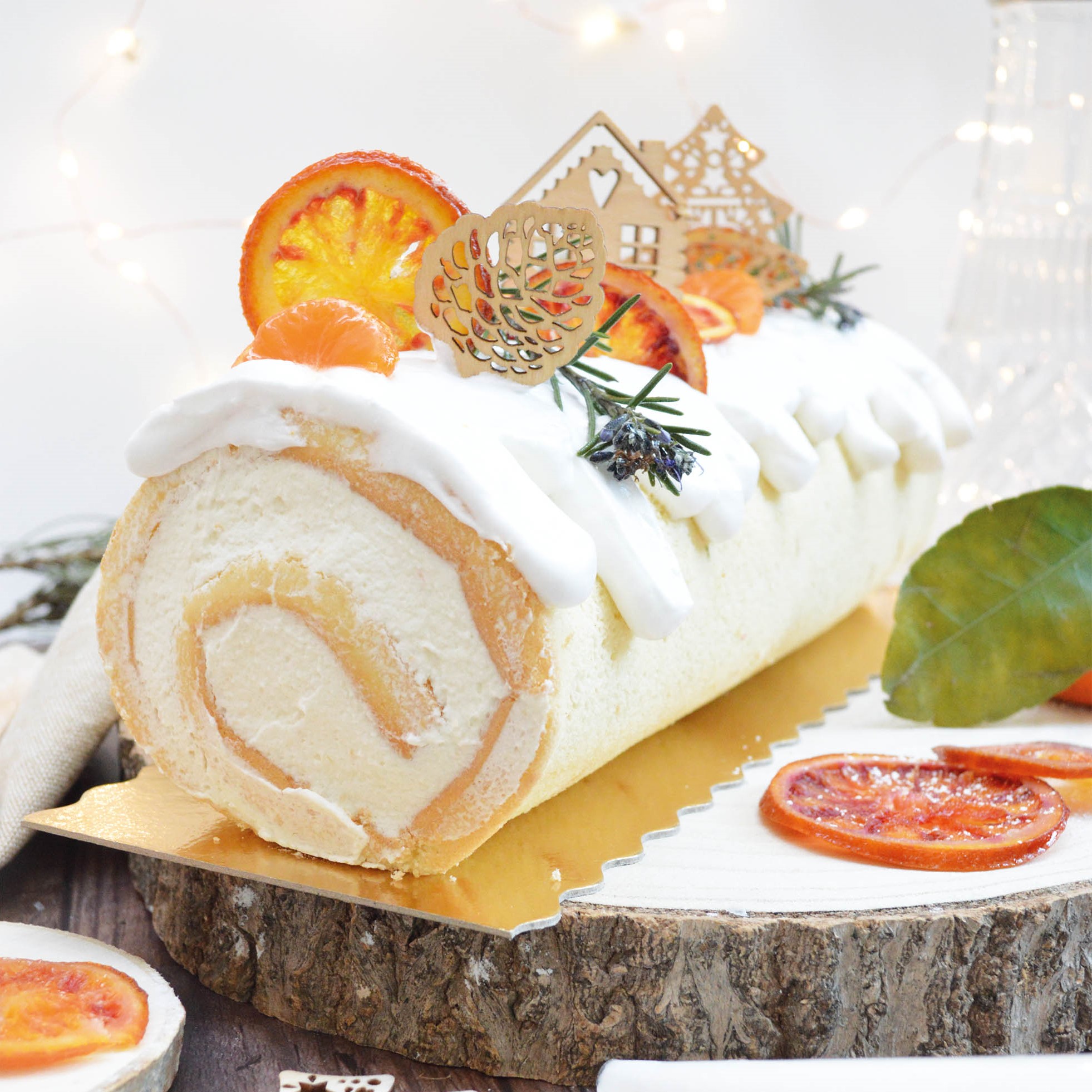 La traditionnelle recette de bûche roulée mélangée à des saveurs originales pour épater vos invités et émerveillez vos papilles. Découvrez une recette originale composée d'une génoise moelleuse, d'une crème chantilly romarin/clémentine et d'une magnifique décoration (une meringue suisse pur l'effet neige et de fines tranches d'agrumes séchés). Une recette parfait pour les amateurs de sucrés/salés.