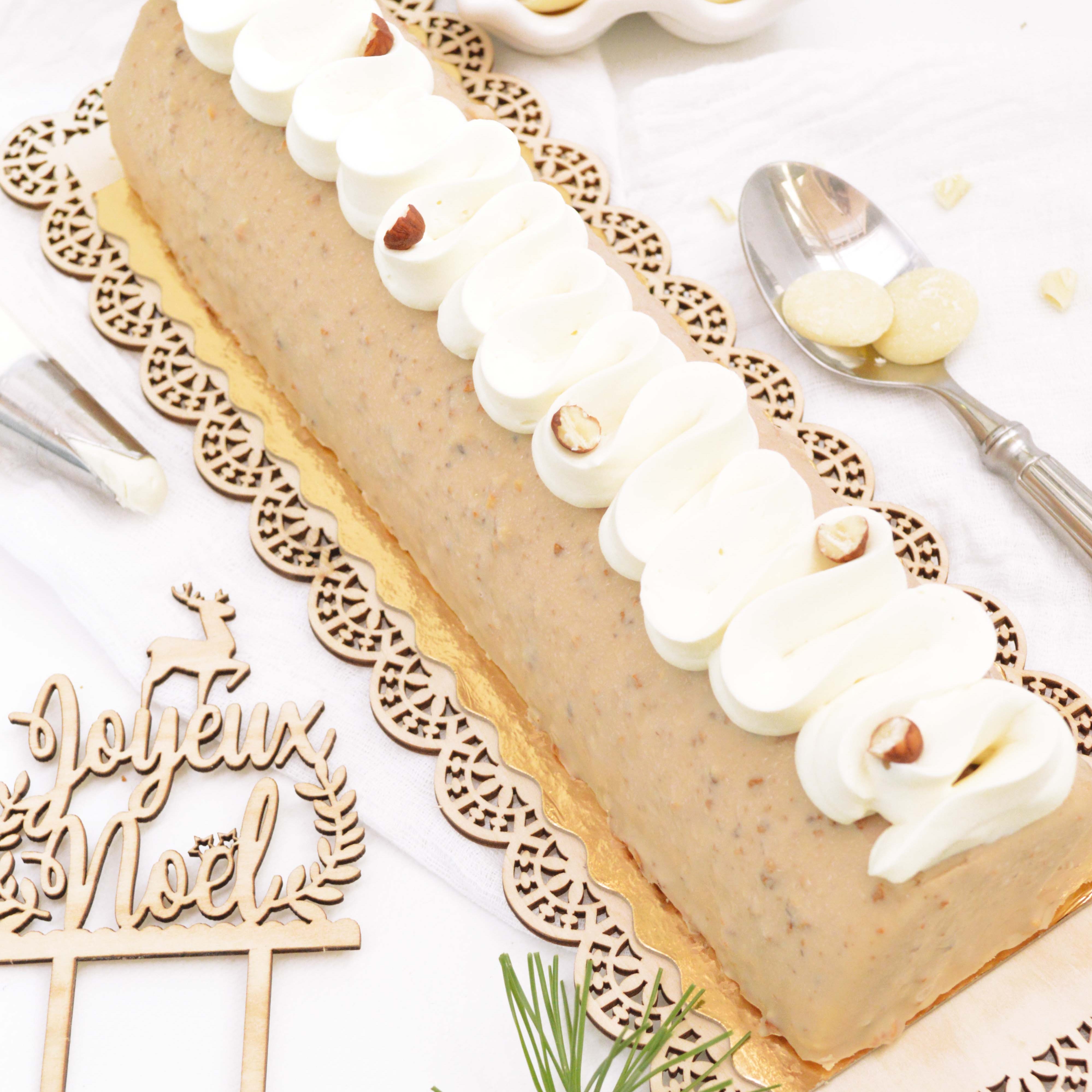 Une touche de noisettes caramélisées mélangée à un croustillant praliné, une mousse praliné, un biscuit dacquoise et une bavaroise chocolat blanc ; Une recette de bûche de Noël parfaite pour célébrer en famille ce moment de partage !