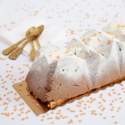 Une bûche originale dans son design façon chalet de montagne ! La recette se compose d'un insert chocolat blanc, une base croquante avec des noisettes et crêpes dentelles, une mousse au chocolat et un biscuit à la cuillère.