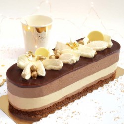 La recette de cette bûche aux 3 chocolats se compose d'une délicieuse base feuillantine au chocolat au lait, un insert au chocolat noir, le tout enrobé dans une mousse au chocolat lait ! Vous retrouverez également une ganache chocolat blanc à poche au dernier moment sur votre bûche. N'hésitez pas à ajouter quelques fruits sur le dessus.