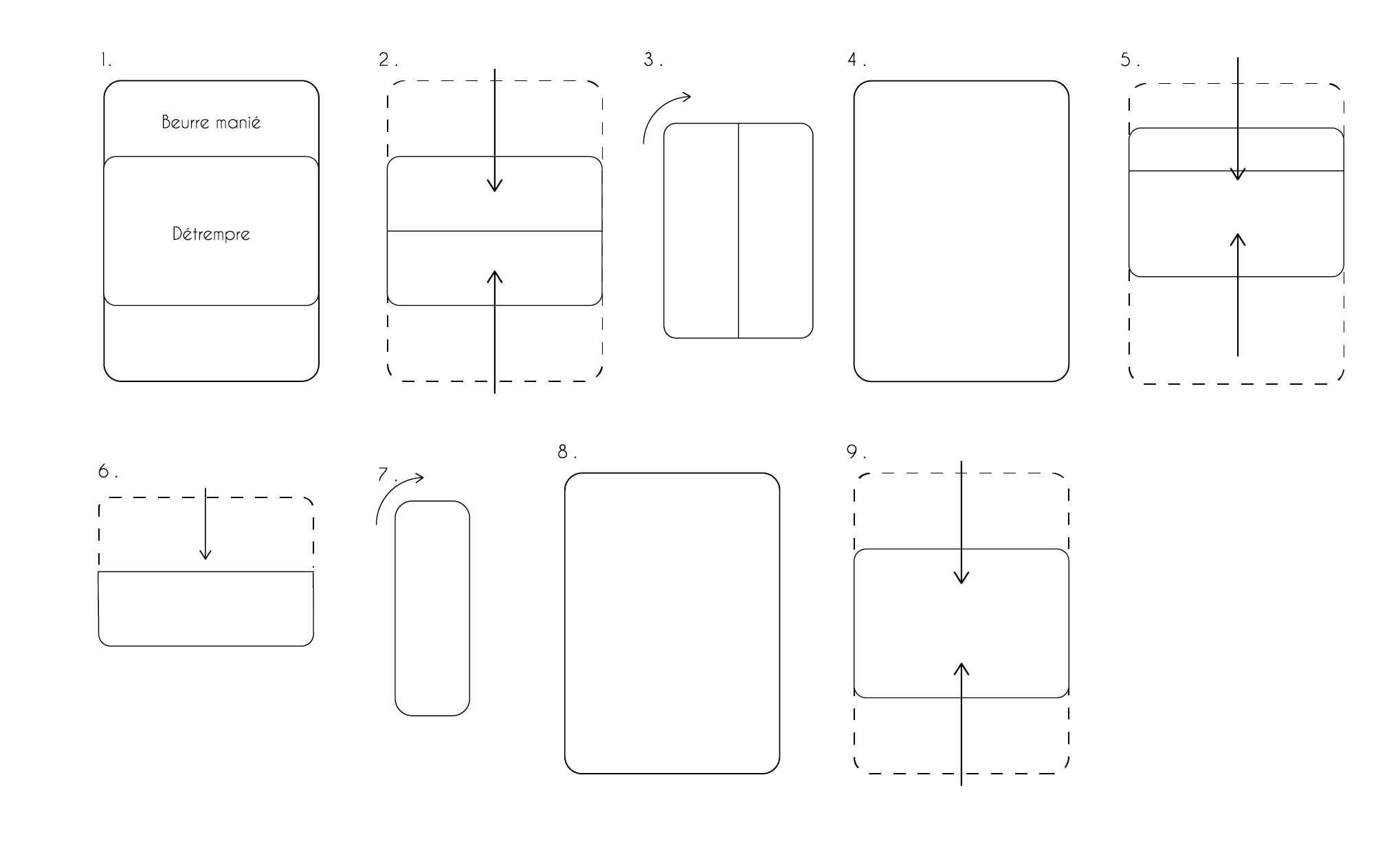 - Pliez la partie inférieure aux 2/3 et la partie supérieure à 1/3 pour faire rejoindre les deux pâtes. Réalisez les étapes 3 à 6 deux fois.
