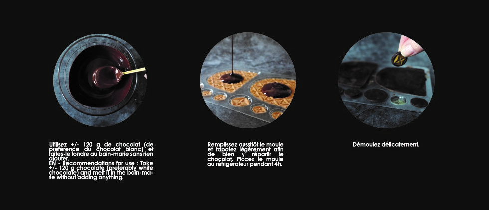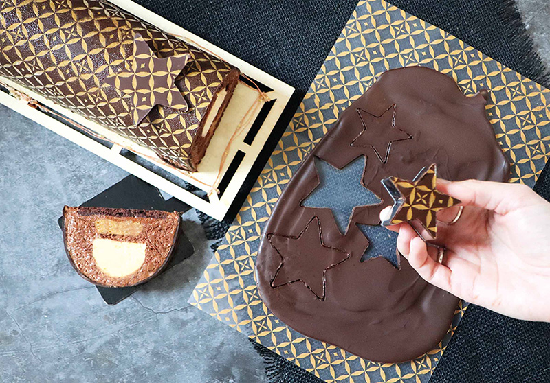 Pour un effet « couture » encore plus impressionnant, n’hésitez pas à compléter la déco de votre bûche avec les embouts en chocolat imprimés et pastilles rondes.