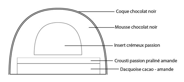 Concevez une bûche très "couture" aussi élégante que savoureuse alliant l'acidité de la passion et la douceur du chocolat noir. Le tout réhaussé par un croustillant passion praliné amande et dacquoise cacao amande.