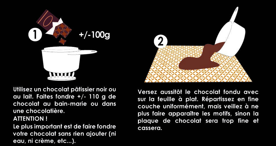 Commencez par placer votre feuille transfert sur une feuille de rhodoid (format A4), ou directement sur une plaque à pâtisserie, motif en beurre de cacao vers le haut.