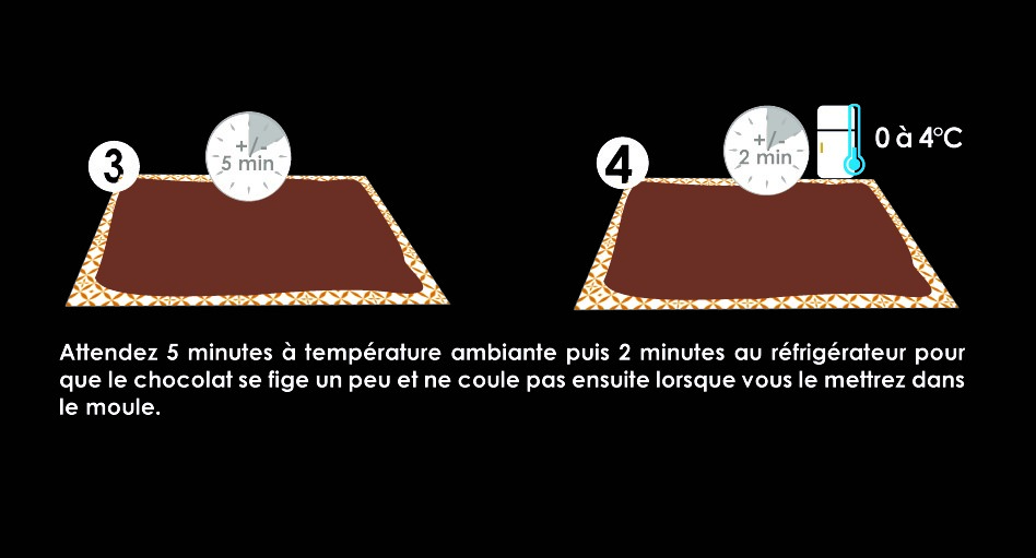 Une fois bien étalé, laissez figer 5 minutes à l’air libre puis 2 min au frigo (pas +).