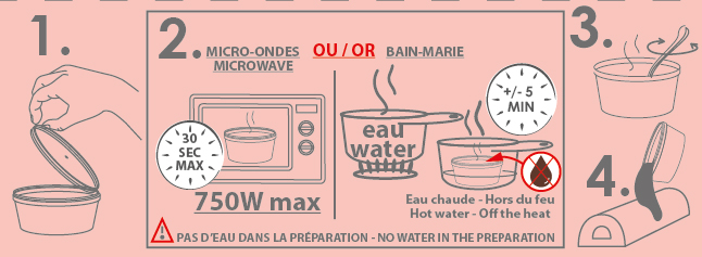 Placez le pot au micro-ondes 30 secondes max (750W max) ou faites bouillir de l'eau et, hors du feu, mettez le pot dedans pour +/-5 min (attention à ne pas mettre d'eau dans le pot !).