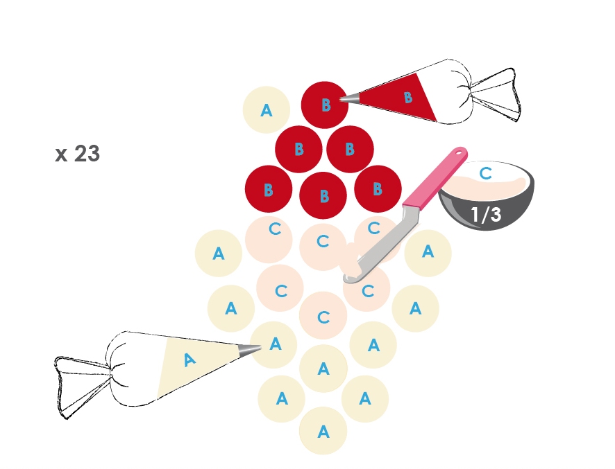 Étape 7 : Divisez la crème en deux. La 1ère moitié restera neutre (=barbe et bonnet du père Noël). Pour la 2ème moitié, divisez de nouveau en 2. Colorez une moitié à l'aide du colorant rouge pour réaliser le bonnet du père Noël (1 à 2 gouttes). Pour l'autre moitié très peu de rouge prélevez une toute petite quantité de colorant à l'aide du dos d'une cuillère à café (= visage du père Noël /couleur chair). Disposez 23 cupcakes en suivant le dessin ci-dessous :