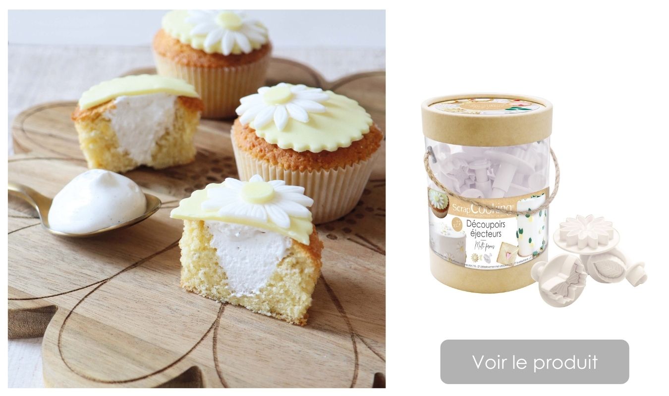 Succombez à ces délicieux cupcakes à la douce saveur de vanille, généreusement fourrés d’une crème chamallow onctueuse, facile à réaliser et au rendu digne d’une pâtisserie professionnelle. Décorés de formes originales découpées à l’aide des emporte-pièces ScrapCooking®, ces gourmandises légères sont idéales pour un goûter rapide ou un dessert fait maison.