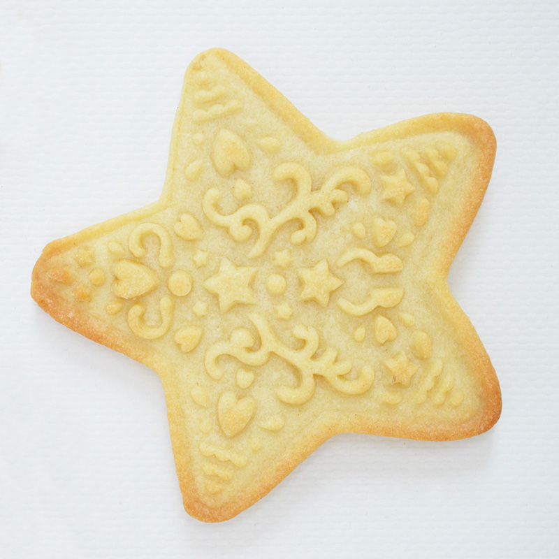 Embossez votre pâte en appliquant le tampon. Choisissez votre face, chacune offre une décoration différente : cœur, rosaces... Découpez ensuite vos biscuits à l'aide du découpoir en inox inclus. Avec sa forme carrée et ses bords cannelés, il est spécialement adapté aux dimensions du tampon.
