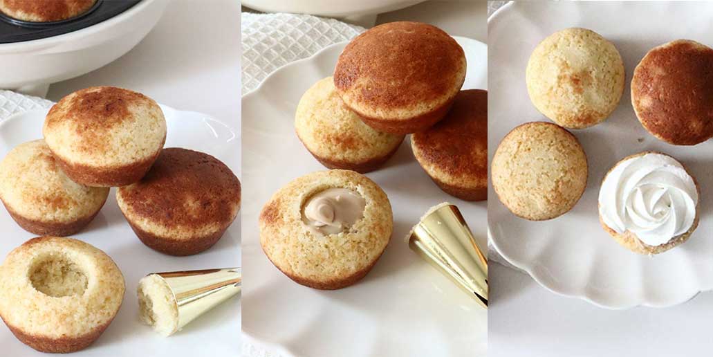Une fois les cupcakes refroidis, à l'aide d'une douille, creusez le centre des cupcakes et versez-y un peu de pâte de fourrage bueno.
