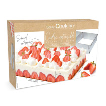 Laissez refroidir avant de découper les rectangles de taille identique. Aidez-vous du cadre pour former une empreinte qui vous guidera pour la découpe. Disposez le cadre sur un support à gâteau puis placez un ruban rhodoïd à l’intérieur. Déposez le premier rectangle de génoise et réservez le 2ème.