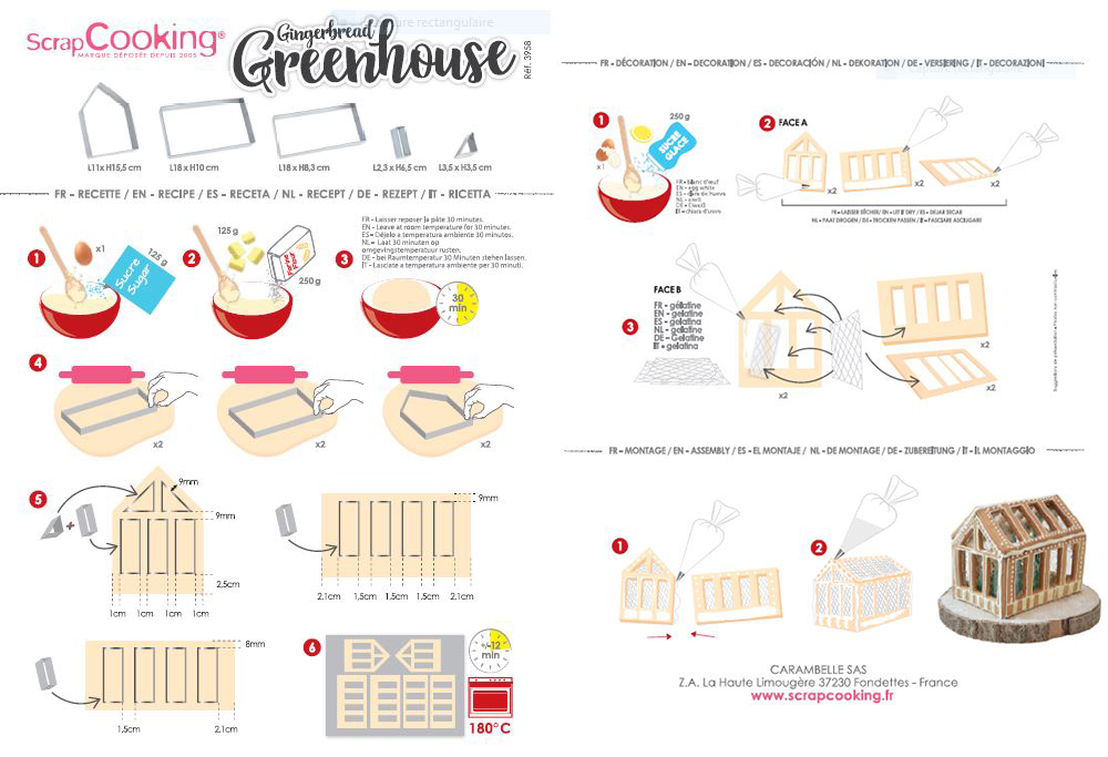 Étape 6 : Une fois le biscuit cuit et refroidi, vous pouvez passer au montage de la structure. Commencez par réaliser la décoration extérieure de la maison sur chaque partie et laissez sécher. Ensuite au verso de chaque partie, appliquez le glaçage puis collez les feuilles de gélatine sur chaque fenêtre et repassez du glaçage dessus pour coller sur les contours. Une fois les fenêtres collées, vous pouvez assembler l’ensemble de la structure en appliquant du glaçage sur les extrémités intérieures des pièces. Pour finir, appliquez du glaçage au niveau des extrémités extérieures des pièces pour un rendu parfait.