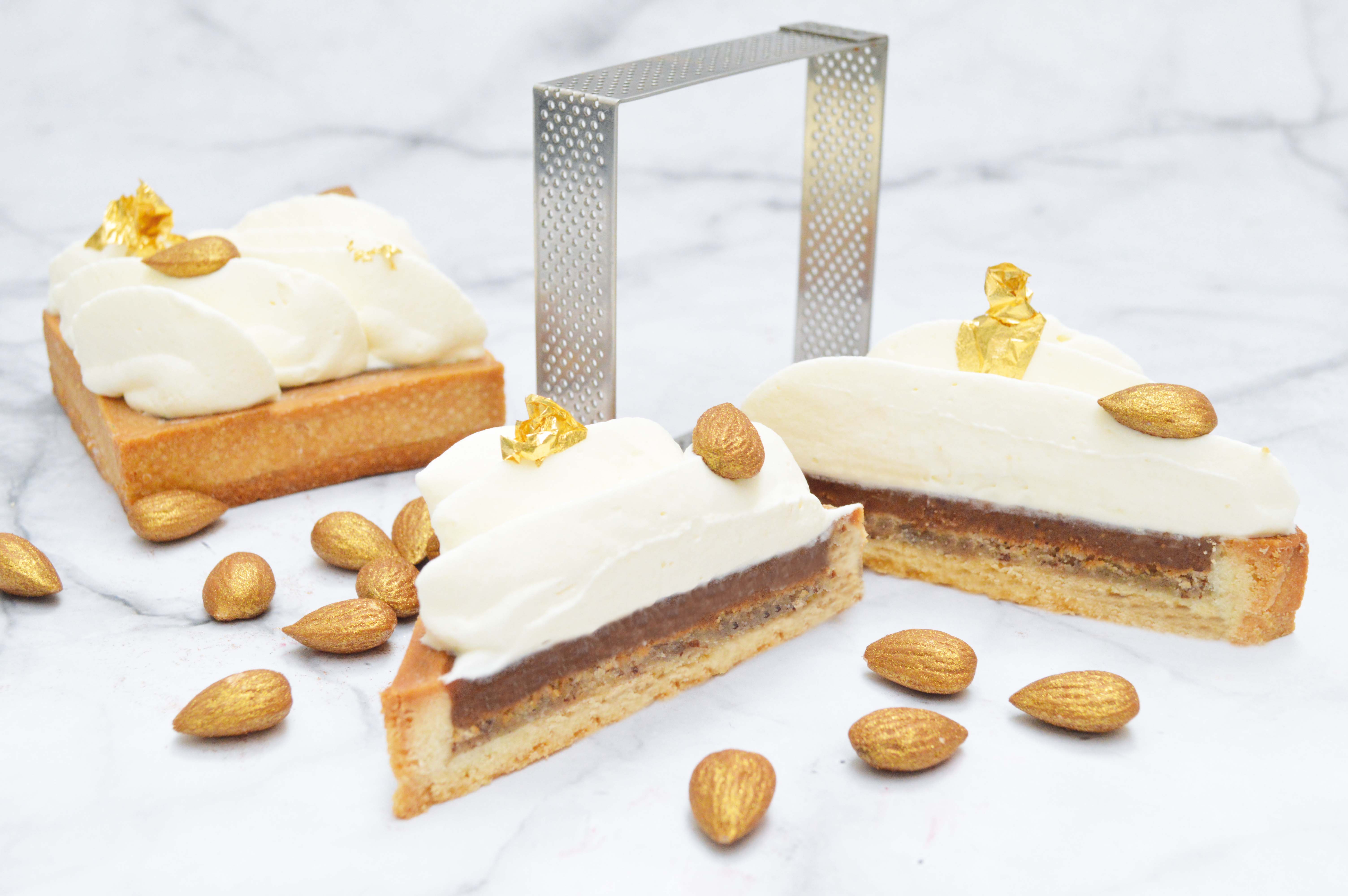 Ces tartelettes carrées se composent d'une pâte sucrée aux amandes, d'une crème de noisettes, d'un caramel onctueux à la pâte de noisettes et d'une ganache montée à la vanille.